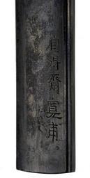 Keywords: Kanpo - Kozuka with a Fan, Medicine Box, Tabacco Pouch, and Netsuke - Walters 51697 - Mark A.jpg This kozuka is surrounded with a raised rim and the background Inside this frame are objects typically carried by men during the Edo period At the right is a fan made of tortoise shell and ivory Next to that in a medicine box inro which was used to carry other small objects in addition medicine Beside the medicine box is a tobacco pouch Both of these objects are attached to a gourd shaped netsuke made of coral The netsuke served as a counterweight to attach the medicine box and the tobacco pouch to the belt of a kimono The kozuka is signed on the back century 19 Edo-Meiji shakudo gold copper coral tortoise shell ivory cm 9 5 accession number 51 697 22240 Henry Walters Baltimore date and mode of acquisition unknown Walters Art Museum Henry Walters Acquired by Henry Walters Signature Jitokusai Kanpo place of origin Japan Walters Art Museum license Tosogu Japanese sword fittings in the Walters Art Museum Kanpo Media contributed by the Walters Art Museum needs category review Media contributed by the Walters Art Museum needs artist update |
