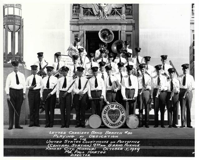 Keywords: smithsonian institution smithsonianinstitution kansas city kansascity missouri usps postoffice mailman band photograph portrait letter carriers lettercarriers group photograph groupphotograph brass instruments brassinstruments black and white blackandwhite heart of america heartofamerica paul hartge national postal museum nationalpostalmuseum mail across the commons mailacrossthecommons team sport sport blackandwhite group performance black and white Description: Band made up of members of the Kansas City Post Office, Branch #30. The band's drum refers to the group as the "Heart of America." According to text on the photograph, they are posed on the U.S. Courthouse and post office at 9th and Grand Avenue in Kansas City, Missouri. The band is directed by Mr. Paul Hartge. Postal employees continue to group together for musical or sports activities outside of the office. Creator/Photographer: Unidentified photographer Medium: Black and white photographic print Culture: American Geography: USA Date: 1939 Collection: U.S. Postal Employees Persistent URL: arago.si.edu/index.asp?con=2&cmd=1&id=194272 Repository: National Postal Museum Accession number: A.2006-20 Description: Band made up of members of the Kansas City Post Office, Branch #30. The band's drum refers to the group as the "Heart of America." According to text on the photograph, they are posed on the U.S. Courthouse and post office at 9th and Grand Avenue in Kansas City, Missouri. The band is directed by Mr. Paul Hartge. Postal employees continue to group together for musical or sports activities outside of the office. Creator/Photographer: Unidentified photographer Medium: Black and white photographic print Culture: American Geography: USA Date: 1939 Collection: U.S. Postal Employees Persistent URL: arago.si.edu/index.asp?con=2&cmd=1&id=194272 Repository: National Postal Museum Accession number: A.2006-20