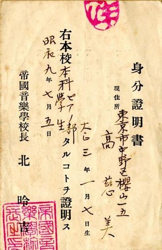 Keywords: Kao Chih-mei certificate 1934.jpg en certificate of identity issued by the Principal of Imperial Music College Tokyo 1934-07-05 http //archives ith sinica edu tw/collections_con php no 97 Prinipal of the Imperial Music School Tokyo other versions Custom license marker 2016 11 19 PD-Japan-exempt Kao Chih-mei Certificates |