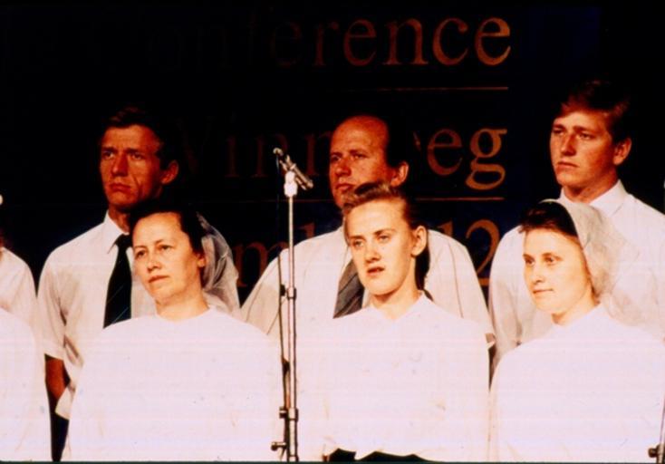 Keywords: karaganda choir karagandachoir mennonite world conference winnipeg manitoba canada mennoniteworldconferencewinnipegmanitobacanada groupshot people Caption: Toews speaking, and part of the Karaganda choir. Citation: Mennonite World Conference. Twelfth Mennonite World Conference, 1990, Winnipeg, Canada. Slides by T. Klassen; Script by John Dyck. X-9 Box 52 Folder 4 Slide 91. Mennonite Church USA Archives - Goshen. Goshen, Indiana. Caption: Toews speaking, and part of the Karaganda choir. Citation: Mennonite World Conference. Twelfth Mennonite World Conference, 1990, Winnipeg, Canada. Slides by T. Klassen; Script by John Dyck. X-9 Box 52 Folder 4 Slide 91. Mennonite Church USA Archives - Goshen. Goshen, Indiana. |