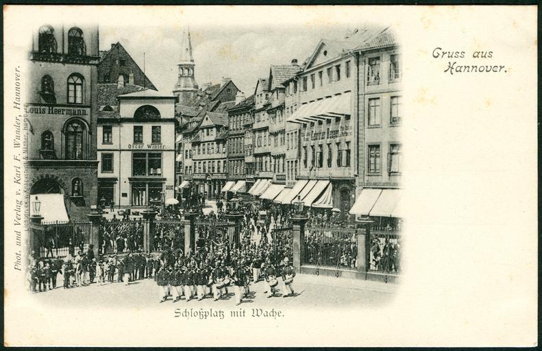 Keywords: Karl F. Wunder PC Gruss aus Hannover. Schloßplatz mit Wache. Bildseite Blick vom Leineschloss zum Holzmarkt Louis Heermann Oscar Winter Gebrüder Bengen Kapelle Pickelhaube Knackstedt & Näther.jpg Blick vor 1896 vom Leineschloss auf den schon damals umzäunten Schlossplatz auf dem vom Holzmarkt und von der Leinstraße eine mit Pickelhauben geschmückte musizierende Militärkapelle einmarschiert beobachtet von zahlreichen Kindern und Bürgern Hannovers An der Schlossstraße ist das Gebäude mit der Aufschrift Louis Heermann zu erkennen Hinter dem Holzmarkt auf dem hier der Holzmarktbrunnen augenscheinlich noch nicht aufgestellt wurde ist an der Pferdestraße wo sich heute das Historische Museum Hannover befindet die Eisenwarengroßhandlung von Oscar Winter zu erkennen In der Bildmitte schaut im Hintergrund die Turmspitze der Kreuzkirche über die Dächer Am rechten Bildrand findet sich das Geschäft der Gebrüder Bengen Dieses Dokument wurde freundlicherweise von Heralde Schmitt-Ulms zum Scannen geliehen um es als Digitalisat bei Commons nachhaltig allen Menschen zu Bildungszwecken zur Verfügung zu stellen Scan vom Original Bernd Schwabe in Hannover ~ 1895 Creator Karl Friedrich Wunder PD-old Documents by Heralde Schmitt-Ulms Numbered postcards by Karl Friedrich Wunder Knackstedt Näther Oscar Winter Schloßstraße Hannover Children in Hannover Leinstraße Hannover Military in Hannover Music of Hannover Leineschloss Schloss- und Stadtkirche St Crucis Hannover Holzmarkt Hannover |