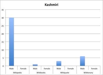 Keywords: Kashmiri Gender Wikiproject.png en Data is from https //toolserver org/~robin/ tool incubatorprefs toolserver and was gather on 29 December 2011 It shows differences in accounts on wiki projects in the language referenced in the file name where users explicitly state their gender This is not all users on a project 2011-12-29 own LauraHale cc-zero Wikimedia statistics Uploaded with UploadWizard Bar charts Diagrams in English Gender |