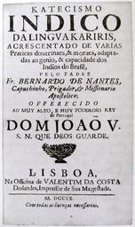 Keywords: Katecismo-indico.jpg Capa do Katecismo Indico da Língua Kariris acrescentado de varias praticas doutrinaes moraes adaptadas ao genio capacidade dos Indios do Brasil do Padre Bernardo de Nantes impresso em Lisboa em 1709 pela Officina de Valentim da Costa Villalta Luiz Carlos O que se fala e o que se lê língua instrução e leitura In Novais Fernando diretor da coleção Souza Laura de Mello e organizadora do volume História da Vida Privada no Brasil vol 1 Cotidiano e vida privada na América portuguesa Companhia das Letras 1997 10ª reimpressão 1709 Padre Bernardo de Nantes PD-old-100 Christian books Literature of Brazil Title pages from Portugal 1709 books Title pages in Portuguese 18th-century books from Portugal |