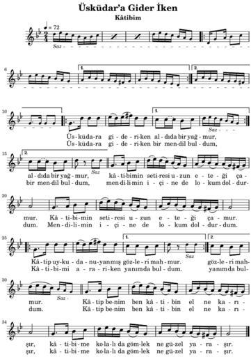 Keywords: Katibim.svg en Famous Türkü from the 19 century Composer and Poet unknown own Baba66 2014-12-15 Done with Lilypond <pre> \version 2 18 2 \header title à sküdar ™a Gider İken subtitle Kâtibim tagline set-default-paper-size a5 set-global-staff-size 17 \pointAndClickOff \paper system-system-spacing basic-distance 17 page-count 1 bottom-margin 0\cm top-margin 0\cm left-margin 0 4\cm right-margin 0 1\cm ragged-last-bottom true notes \key bes \major \time 2/4 \tempo 4 72 \relative c \tiny \set crescendoText \markup Saz \set crescendoSpanner 'text \override DynamicTextSpanner style 'dashed-line \repeat percent 3 d16\< es d c bes a bes c d es d c bes a g8 \repeat volta 2 d16 g8 a16 bes8 c d16 es d c bes a g8 \alternative a16 c bes a a g fis g a bes a g f es d8 a'16 c bes a a g g fis g8 g16 g8 g\ \normalsize \repeat volta 2 g8 d'16 d8 d8 es16 d es fis d8 d \alternative c8 \tieDashed c16~ c bes8 c d16 \set crescendoText \markup Saz \set crescendoSpanner 'text \override DynamicTextSpanner style 'dashed-line \tiny es\< d c bes a g8\ \normalsize c8 \tieDashed c16~ c bes8 c d8 r \set crescendoText \markup Saz \set crescendoSpanner 'text \override DynamicTextSpanner style 'dashed-line \tiny d8\< d\ \normalsize \bar g 8 a16 bes8 c d16 es d c bes a g8 a16 c bes a a g fis g a2 g8 a16 bes8 c d16 es d c bes a g8 a16 c bes a a g fis g g2 \repeat volta 2 g8 d'16 d8 d8 es16 d es fis d8 d \alternative \normalsize c8 c bes c d8 r \set crescendoText \markup Saz \set crescendoSpanner 'text \override DynamicTextSpanner style 'dashed-line \tiny d8\< d\ \normalsize c8 c bes c d16 es d c \set crescendoText \markup Saz \set crescendoSpanner 'text \override DynamicTextSpanner style 'dashed-line \tiny bes16\< a g8\ \normalsize \bar g8 a16 bes8 c d16 es d c bes a g8 a16 c bes a a g fis g a2 g8 a16 bes8 c d16 es d c bes a g8 a16 c bes a a g fis g g2 \bar \addlyrics à s -- kü -- da -- ra gi -- de -- ri -- ken al -- dıda bir yaÄŸ -- mur al -- dıda bir yaÄŸ -- mur kâ -- ti -- bi -- min seti -- resi u -- zun e -- te -- ÄŸi ça -- mur Kâ -- ti -- bi -- min seti -- resi u -- zun e -- te -- ÄŸi ça -- mur Kâ -- tip uy -- ku -- da -- nu -- yan -- mış göz -- le -- ri mah -- mur göz -- le -- ri mah -- mur Kâ -- tip be -- nim ben kâ -- ti -- bin el ne ka -- rı -- şır kâ -- ti -- bi -- me ko -- la -- lı da göm -- lek ne gü -- zel ya -- ra -- şır \addlyrics à s -- kü -- da -- ra gi -- de -- ri -- ken bir men -- dil bul -- dum bir men -- dil bul -- dum men -- di -- li -- min i -- çi -- ne de lo -- kum dol -- dur -- dum Men -- di -- li -- min i -- çi -- ne de lo -- kum dol -- dur -- dum Kâ -- ti -- bi -- mi a -- ra -- ri -- ken ya -- nım -- da bul -- dum ya -- nım -- da bul -- dum Kâ -- tip be -- nim ben kâ -- ti -- bin el ne ka -- rı -- şır kâ -- ti -- bi -- me ko -- la -- lı da göm -- lek ne gü -- zel ya -- ra -- şır \new Staff \notes </pre> Sheet music from Turkey Cc-zero
