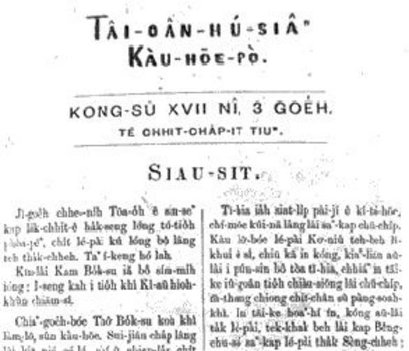 | Keywords: Kauhoe.jpg The March en 1891 issue of Taiwan Provincial Church News Tâi-oân-hú-siâ Kàu-hōe-pò 台灣 城教 報 an example of Taiwanese written in en Latin characters This is the first publication in Taiwan From http //ebook de-han org/attitude/taibun/ch2/kauhoe gif en wikipedia 2004-05-08 Kaihsu wikipedia en In Chinese characters colspan 2 台灣 城 - colspan 2 教 報 - colspan 2 光緒XVII年,3 - colspan 2 第七十 張 - colspan 2 消息 - <span> </span>二 裡大學的先生 及六七 學生攏抵著 破病 禮 x攏無人 於 冊 旦已經好啦 <span> </span>xxx牧師亦無 麼 用;醫生共伊著去xx歇 暫時 <span> </span>正 尾桃牧師閣去 xxx教 雖然十人 end of first column <span> </span>於遐亦設立 二的祈禱 , 姊妹幾若人來參及聚集 到落尾禮 姑娘於 離 開的時,就共 講,xx後 來伊 身無帶於遐,請 大 家猶原著照常來聚集, 不 將 x事放煞 去 大家歡 應,講後來 禮 ,的確 來及x xx參及禮 聖冊; end of second column Converted to very literal Mandarin diferences in red colspan 2 台灣 城 <font color red>台南</font> - colspan 2 教 報 - colspan 2 光緒XVII年 <font color red>1891</font> ,3 - colspan 2 第七十 張 - colspan 2 消息 - <span> </span>二 裡大學的<font color red> 師</font> <font color red>和</font>六七 學生<font color red>都遭到 生</font>病 禮 x<font color red>都沒人 </font> <font color red>書</font> <font color red>現 </font>已經好啦 <span> </span>xxx牧師<font color red>也沒</font> 麼 用;醫生<font color red>叫他就</font>去xx<font color red>休 息</font>暫時 <span> </span>正 <font color red>底</font>桃牧師<font color red>又</font>去 xxx教 雖然十人 end of first column <span> </span><font color red> 那裡也</font>設立<font color red>禮</font> 二的祈禱 , 姊妹幾<font color red> </font>人來<font color red> 起</font>聚集 到禮 <font color red>快結 </font>姑娘<font color red>要</font>離 開時,就<font color red>跟她 </font>講,xx後 來<font color red>她</font> 身<font color red>沒住 那裡</font>,請<font color red>她 </font>大 家猶原<font color red>就</font>照常來聚集, 不<font color red>可</font>將 x事放 去<font color red>就算了</font> <font color red>她 </font>大家<font color red>高興</font>應,講後來 <font color red>每</font>禮 ,的確<font color red>要</font>來<font color red>和</font>x xx<font color red> 起</font>禮 聖<font color red>書</font>; end of second column English Translation roughly the same words on each line as the original colspan 2 Taiwan Seat of Government en Tainan - colspan 2 Church News - colspan 2 17th Year of Guangxu 1891 Third Lunar Month - colspan 2 Issue no 71 - colspan 2 News - <span> </span>In the first part of the second lunar month a university professor and six or seven students all got sick This week there was nobody that was studying Now everybody is all better <span> </span>Pastor xxx also was of no use; the doctor told him to go to xx to rest for the time being <span> </span>At the end of the first lunar month Pastor Tao again went to xxx church Although ten people end of first column <span> </span>They also set up a Tuesday prayer meeting where several of the sisters all gathered together Near the end of the service as the girls were about to leave they were told if later on they don't live there that everyone please still come to get together as usual they mustn't use such a thing as an excuse to simply give up They all happily agreed saying that afterwards they would come for sure every week x xx worship and read the holy book together; end of second column PD-old original upload log page en wikipedia Kauhoe jpg 2004-05-08 21 28 Kaihsu 293×252×8 19402 bytes <nowiki>The first issue of Taiwan Church News July 1885 an example of Taiwanese written in Latin characters This is the first publication in Taiwan From http //ebook de-han org/attitude/taibun/ch2/kauhoe gif The object of</nowiki> Taiwanese pronunciation Christianity in Taiwan Presbyterianism Pe̍h-ōe-jī |