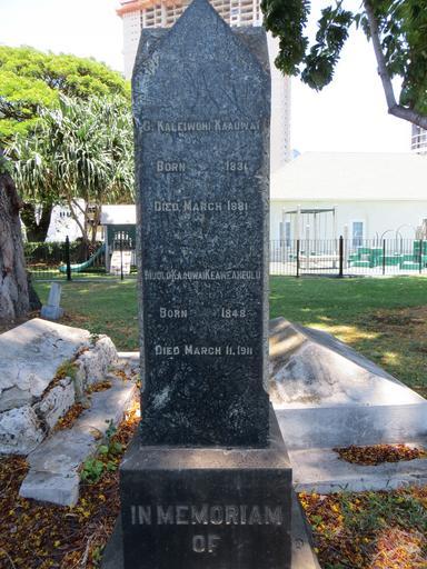 Keywords: KawaiahaoChurchcemetery-Kapiolanifamilyplot-Kaauwai1831-81.jpg en Grave marker of G Kaleiwohi Ka ˜auwai b 1831 d March 1881 and Muolo Ka ˜auwai Keaweheulu b 1848 d 11 March 1911 in Kawaiaha ˜o Church cemetery Honolulu Hawaii These were the parents of Princess Elizabeth Kahanu KalanianaÊ»ole 2014-06-16 12 37 28 own Joel Bradshaw cc-zero Cemeteries in Hawaii KawaiahaÊ»o Church Uploaded with UploadWizard Elizabeth Kahanu KalanianaÊ»ole |