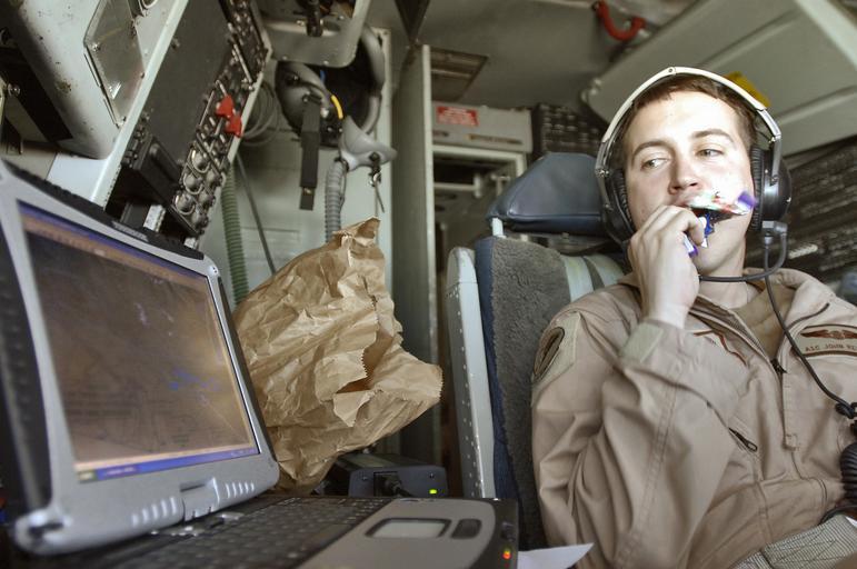 Keywords: KC-135R-T Stratotanker DVIDS21000.jpg en Airman 1st Class John Reschke has lunch aboard a KC-135R/T Stratotanker while on the way to an air refueling mission in support of Operation Iraqi Freedom With a little more than two years in the U S Air Force and only a few weeks after accomplishing certification in his job as the refueling boom operator he was deployed to the 340th Expeditionary Air Refueling Squadron Southwest Asia Sitting at the former navigation station he is enjoying a candy bar while keeping an eye on a GPS aided laptop that shows a constantly moving updated display of the aircraft's position on a standard navigational chart This is one of many onboard systems that helps the crew know exactly where they are day or night and in all weather conditions He is a native of Orlando Fla and is stationed with the 905th Air Refueling Squadron Grand Forks Air Force Base ND U S Air Force photo/Master Sgt Lance Cheung 2006-05-14 Lance Cheung https //www dvidshub net/image/21000 21000 2006-05-22 14 22 PD-USGov Grand Forks Air Force Base Images from DoD uploaded by Fæ |