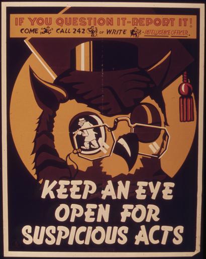 Keywords: "Keep an eye open for suspicious acts." - NARA - 514758.tif Scope and content General notes 514758 Local identifier 44-PA-1162 Office for Emergency Management Office of War Information Domestic Operations Branch Bureau of Special Services 03/09/1943 - 09/15/1945 Still Picture Records Section Special Media Archives Services Division NWCS-S National Archives at College Park 8601 Adelphi Road College Park MD 20740-6001 1941 - 1945 Record group Record Group 44 Records of the Office of Government Reports 1932 - 1947 Record group ARC 373 World War II Posters compiled 1942 - 1945 Series ARC 513498 File unit File unit ARC Variant control numbers NAIL Control Number NWDNS-44-PA-1162 yes Other versions <gallery> File Keep_an_eye_open_for_suspicious_acts _-_NARA_-_514758 tif tif File Keep_an_eye_open_for_suspicious_acts _-_NARA_-_514758 jpg jpg </gallery> NARA-cooperation PD-USGov World War II posters from the United States NARA TIF images with categorized JPGs |