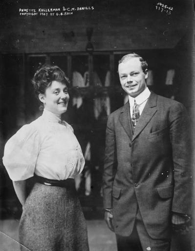 Keywords: KellermanDanielsStanding.jpg Swimmers Annette Kellerman and C M Charles Meldrum Daniels 1907 G G Bain photo via Library of Congress at http //lcweb2 loc gov/cgi-bin/query/h pp/PPALL field NUMBER+ 1 ggbain+00678 Converted from TIFF to jpg and border cropped before upload 1907 G G Bain PD-US PD-Bain C M Daniels Annette Kellerman Smiling Fashion in 1907 Charles Daniels Collection Photos |