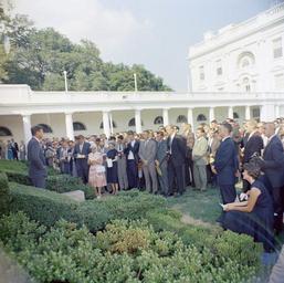Keywords: Kennedy Peace Corps group 1961 B003a.jpg August 28 1961 - President Kennedy hosts a ceremony at the White House Rose Garden in honor of the first groups of Peace Corps Volunteers departing for service in Ghana and Tanzania Two days later the first group of 51 Peace Corps Ghana Volunteers arrived in Accra Ghana to serve as teachers https //www facebook com/USEmbassyGhana/photos/pb 146328372149587 -2207520000 1445769554 /818514384930979/ type 3 theater Facebook profile of the US Embassy Ghana 1961-08-28 official photographer of the US government PD-USGov This photo was publicised by the US Embassy in Ghana with the license public US Peace Corps in Ghana John F Kennedy in 1961 White House Rose Garden Relations of Tanzania and the United States |