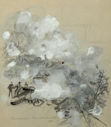 | Keywords: Kennesaw bombardment2.jpg  Kennesaw's Bombardment 64 1 drawing on light gray paper pencil Chinese white and black ink wash Digitized from original Library of Congresshttp //hdl loc gov/loc pnp/ppmsca 17637 1864 June 27 Waud Alfred R Alfred Rudolph 1828-1891 Partially restored version of File Kennesaw bombardment jpg Cropped Dirt and librarian's notes removed Localized brightness adjustments gradient masks and localized color and saturation adjustments applied to correct uneven tone in background paper Curves adjustment See also File Kennesaw bombardment1 tif partial restoration and File Kennesaw bombardment2 tif full restoration uncompressed Assessments 1 Battle of Kennesaw Mountain PD-old Alfred Waud 1864 |
