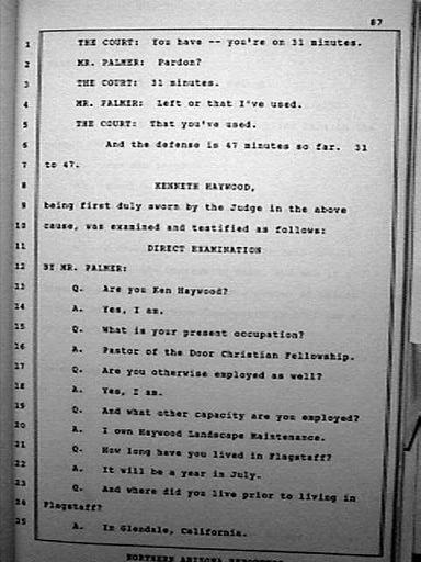 | Keywords: Kenneth Haywood Perjury P87.JPG en Page 87 of 247 page Transcript of official court document Official Court Document Flagstaff AZ Coconinio County Superior Court CV95-00118 Northern Arizona Reporters 418 East Birch Avenue P O Box 22142 Flagstaff AZ 86001 1995-06-06 Kenneth Haywood |