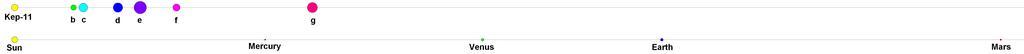 | Keywords: Kepler-11 sideview withsolarsystem.png File Kepler-11 side view with solar system svg en en Kepler-11 planetary system with inner solar system comparison star diameters are true while plantary diameters are scaled up by a factor of 50 own Tomruen 2011-02-03 Kepler-11 |