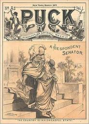 Keywords: Keppler - Simon Cameron.jpg A Despondent Senator 9 w x 12-1/2 h caricature depicts Pennsylvania Republican leader Simon Cameron three-term U S Senator and Lincoln's somewhat scandalous Secretary of War on the occasion of his 1877 resignation from the Senate with assurances that the Pennsylvania legislature would appoint his son in his stead In the caricature his right hand holds a paper saying Hayes' Cabinet and his left has a handkerchief labeled Mrs Oliver Caption at bottom says in quotation marks The country's in a dreadful state Retrieved from http //www greatcaricatures com/keppler/1877_0321_senator shtml Published in Puck Magazine Cover Vol 1 No 2 March 21 1877 Joseph Keppler Uncreative reproduction of a two-dimensional public domain work found online PD-old PD-US Puck magazine Simon Cameron Caricatures of politicians Joseph Keppler 1877 cartoons 1870s political cartoons of the United States 1877 magazines Handkerchiefs in art |
