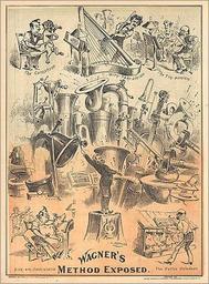 | Keywords: Keppler - Wagner's Method Exposed.jpg Wagner's Method Exposed Caricature depicts Richard Wagner and hypothesizes how his music might be made Musicans at the top play the Catophone a cat played with a bow Wire-rake-oloide a harp played with a metal rake and the Tin-panium pans and large knives In the center Wagner conducts enormous instruments that dwarf the musicians who play them At the bottom a man squeezes a dog ” the Sick-em-Jackionette ” and a combination of a xylophone and pigs feeding from a trough constitute the Porko Melodeon Retrieved from http //www greatcaricatures com/keppler/1877_0314_wagner shtml Published in Puck Magazine Back Cover Vol 1 No 1 March 14 1877 Joseph Keppler Uncreative reproduction of a two-dimensional public domain work found online Puck magazine Caricatures of musicians Joseph Keppler Satirical depictions related to Richard Wagner Music in 1877 Musical instruments in art 1877 cartoons PD-old PD-US Music in art Animals in art Cats and music Dogs and music Pigs and music People with pigs |