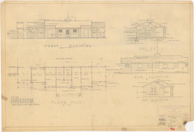 | Keywords: ccc civilian conservation corps civilianconservationcorps texas state parks texasstateparks kerrville-schreiner state park kerrvilleschreinerstatepark document sketch text drawing writing Title: Barn (Stable) Specific Date: 9/28/1936 Architect: Smith, Olin, draftsman Remarks: Pencil and colored pencil on paper showing barn (stable), including front elevation, section A-A, rear elevation, end elevation, floor plan. Dimensions: LN: 35.50" x WD: 24.375" Title: Barn (Stable) Specific Date: 9/28/1936 Architect: Smith, Olin, draftsman Remarks: Pencil and colored pencil on paper showing barn (stable), including front elevation, section A-A, rear elevation, end elevation, floor plan. Dimensions: LN: 35.50" x WD: 24.375" |