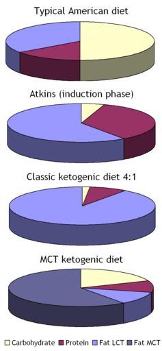 | Keywords: Ketogenic diets pie.png Ketogenic diets pie svg A series of pie charts depicting the calorific contributions from carbohydrate protein and fat in four diets the typical American diet; the Atkins diet during the induction phase; the classic ketogenic diet in a 4 1 ratio of fat to combined protein and carbohydrate by weight ; and the MCT oil ketogenic diet Sources Last AR Wilson SA http //www aafp org/afp/20060601/1942 html Low-carbohydrate diets Am Fam Physician 2006 Jun 1;73 11 1942-8 PMID 16770923 Huttenlocher PR Wilbourn AJ Signore JM Medium-chain triglycerides as a therapy for intractable childhood epilepsy Neurology 1971 Nov;21 11 1097-103 PMID 5166216 http //www shsna com/pages/ketocal htm SHS KetoCal Cited 18 March 2008 Data values carbohydrate protein fat LCT and fat MCT Percentage of calories Typical American 50 15 35 0 Atkins induction phase 5 35 59 0 Classic ketogenic 1 6 8 4 90 0 MCT ketogenic 19 10 11 60 Own 2008-03-18 Colin Nutrition |