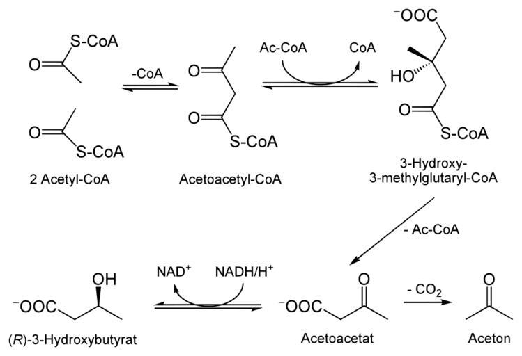 Keywords: Ketone bodies synthesis.svg en Synthesis of ketone bodies from acetyl-CoA de Synthese von sog Ketonkörpern aus Acetyl-CoA Own Yikrazuul 07 06 08 Ketones Carbohydrate metabolism Starvation