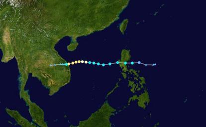 | Keywords: Ketsana 2009 track.png Track map of Typhoon Ketsana of the 2009 Pacific typhoon season The points show the location of the storm at 6-hour intervals The colour represents the storm's maximum sustained wind speeds as classified in the Saffir-Simpson Hurricane Scale see below and the shape of the data points represent the nature of the storm according to the legend below User Nilfanion/Tc/T Created by Cyclonebiskit using Wikipedia WikiProject Tropical cyclones/Tracks The background image is from NASA Tracking data switch source from the National Hurricane Center <sup>http //www nhc noaa gov/pastall shtml</sup> from the Central Pacific Hurricane Center <sup>http //www prh noaa gov/cphc/summaries/</sup> from the Joint Typhoon Warning Center <sup>https //metocph nmci navy mil/jtwc/best_tracks/</sup> from the Japan Meteorological Agency <sup>http //www jma go jp/jma/jma-eng/jma-center/rsmc-hp-pub-eg/besttrack html</sup> from the National Hurricane Center <sup>http //www nhc noaa gov/pastall shtml and the Central Pacific Hurricane Center http //www prh noaa gov/cphc/summaries/</sup> from the Central Pacific Hurricane Center <sup>http //www prh noaa gov/cphc/summaries/ and the Joint Typhoon Warning Center https //metocph nmci navy mil/jtwc/best_tracks/</sup> from the w National Hurricane Center <sup>http //www nhc noaa gov/pastall shtml</sup> or the Joint Typhoon Warning Center <sup>https //metocph nmci navy mil/jtwc/best_tracks/</sup> 2009-09-27 Cyclonebiskit Typhoon Ketsana 2009 2009 Pacific typhoon season track maps |