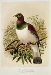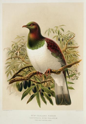 | Keywords: drawing illustration photo border Shows wood pigeon or kereru, sitting on tawa tree. Inscriptions: Inscribed - Recto - bottom right: Judd & Co. Limited, Imp.. Quantity: 1 colour art print(s) in book.. Physical Description: Lithograph, coloured 274 x 206 mm. Keulemans, John Gerrard, 1842-1912. Keulemans, John Gerrard 1842-1912 :New Zealand pigeon. Carpophaga Novae Zealandiae. (one-half natural size). / J. G. Keulemans delt. & lith. [Plate XXIV. 1888].. Buller, Walter Lawry (Sir) 1838-1906 :A history of the birds of New Zealand. 2d ed. London, John van Voorst, 1888.. Ref: PUBL-0012-24. Alexander Turnbull Library, Wellington, New Zealand. natlib.govt.nz/records/22326260 Shows wood pigeon or kereru, sitting on tawa tree. Inscriptions: Inscribed - Recto - bottom right: Judd & Co. Limited, Imp.. Quantity: 1 colour art print(s) in book.. Physical Description: Lithograph, coloured 274 x 206 mm. Keulemans, John Gerrard, 1842-1912. Keulemans, John Gerrard 1842-1912 :New Zealand pigeon. Carpophaga Novae Zealandiae. (one-half natural size). / J. G. Keulemans delt. & lith. [Plate XXIV. 1888].. Buller, Walter Lawry (Sir) 1838-1906 :A history of the birds of New Zealand. 2d ed. London, John van Voorst, 1888.. Ref: PUBL-0012-24. Alexander Turnbull Library, Wellington, New Zealand. natlib.govt.nz/records/22326260 |