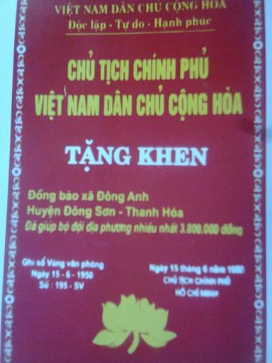 Keywords: Khen thuong xa Dong Anh.JPG vi Lá c Chủ tịch Hồ Chí Minh tặng xã Đông Anh ngày 15-6-1950 do có thành tích cao nhất 3 800 000 đồng trong việc giúp bộ đội địa phương Xã Đông Anh lúc th i điểm đó hiện nay là các xã Đông Anh Đông Thịnh Đông Xuân xóm Nghĩa xã Đông Tiến và một phần thị trấn Rừng Thông 2011-09-03 own Hungda cc-zero Uploaded with UploadWizard Thanh Hoa Province |