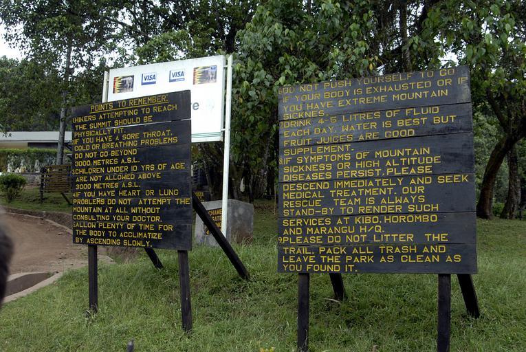 Keywords: Kili warning signs px1000.jpg Kilimanjaro caution signs at the Machamé trailhead 2008 own 2008-09-30 2008-09 Greg Bulla gregbulla com Gb1 en Original upload log en wikipedia FtCG page en wikipedia Kili_warning_signs_px1000 jpg wikitable Date/Time Dimensions User Comment - 05 28 24 September 2009 1 000 × 669 440 790 bytes Gb1 w en <nowiki> Kilimanjaro caution signs at the Machamé trailhead 2008 I created this work entirely by myself Sept 2008 Greg Bulla </nowiki> location possible September 2008 in Tanzania Caution signs Signs at Kilimanjaro Mountaineering in Tanzania Kilimanjaro in 2008 |