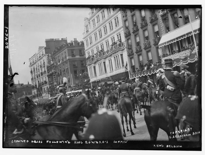 | Keywords: (King of Belgium and other) Crowned heads following King Edward's coffin (London) (LOC) (27600445470).jpg Bain News Service publisher King of Belgium and other Crowned heads following King Edward's coffin London between ca 1915 and ca 1920 1 negative nitrate ; 5 x 7 in or smaller Notes Title from unverified data provided by the Bain News Service on the negatives or caption cards Forms part of George Grantham Bain Collection Library of Congress Subjects London Format Nitrate negatives Rights Info No known restrictions on publication Repository Library of Congress Prints and Photographs Division Washington D C 20540 USA http //hdl loc gov/loc pnp/pp print hdl loc gov/loc pnp/pp print General information about the Bain Collection is available at http //hdl loc gov/loc pnp/pp ggbain hdl loc gov/loc pnp/pp ggbain Higher resolution image is available Persistent URL http //hdl loc gov/loc pnp/ggbain 27100 hdl loc gov/loc pnp/ggbain 27100 Call Number LC-B21- 2046-1 https //www flickr com/photos/library_of_congress/27600445470/ King of Belgium and other Crowned heads following King Edward's coffin London LOC LOC-image ggbain 27100 https //www flickr com/people/8623220 N02 The Library of Congress http //www loc gov/rr/print/195_copr html noknown The Library of Congress Flickr Commons PD-Bain The Library of Congress https //flickr com/photos/8623220 N02/27600445470 2016-09-08 05 14 41 pd Uncategorized 2016 December 20 |