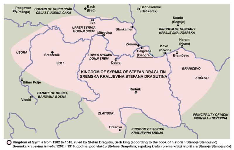 Keywords: Kingdom of syrmia according to stanoje stanojevic.png en Kingdom of Syrmia from 1282 to 1316 ruled by Stefan Dragutin Serb king according to the book of historian Stanoje Stanojević sr Sremska kraljevina između 1282 i 1316 godine pod vlašću Stefana Dragutina srpskog kralja prema knjizi istoričara Stanoja Stanojevića own PANONIAN 2011 Cc-zero References Primary source Made according to the historical map from this book Stanoje Stanojević Istorija srpskog naroda Beograd 2009 map from this book can be also found here http //www dodaj rs/f/2h/wh/jqXNW7r/nemanjicskadrzava jpg Secondary sources http //img42 imageshack us/img42/8927/1353 png Similar map of Dragutin's realm from Croatian source http //www hercegbosna org/forum/povijest/hrvatska-povijest-u-kartama-t1419 html from book Hrvatska povijest u 25 karata written by Stjepan Srkulj and Josip Lučić http //www dodaj rs/f/1L/Lu/1NSQreXm/1353 png http //www dodaj rs/f/2i/vQ/1h9yeauE/dusan jpg http //www dodaj rs/f/3J/Ir/22O0Tjch/img1535 jpg Dr Aleksa Ivić Istorija Srba u Vojvodini Novi Sad 1929 page 6 Milojko Brusin Srpsko-hrvatski odnosi i Srbi u Hrvatskoj Novi Sad 2008 page 22 Maps of the history of Serbia in the 13th century Maps of the history of Serbia in the 14th century Maps of the Kingdom of Serbia medieval Maps of the history of Vojvodina Maps of the history of Syrmia Maps of the history of Mačva Maps of the history of Bosnia and Herzegovina in the Middle Ages Maps of the history of Republika Srpska Maps in Serbian Stefan Dragutin |