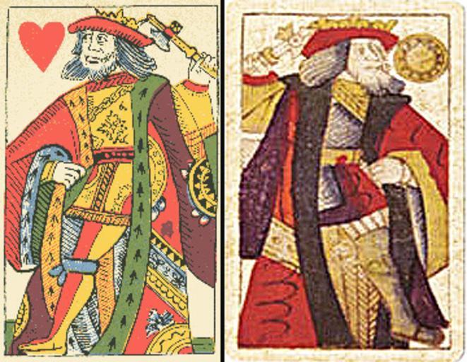 Keywords: Kings-comparison.jpg comparison between king of heart and king of coins diamonds of the French and the Spanish made by Philippe Ayet deks 2006-11-30 F l a n k e r PD-old Kings of Hearts Kings of Coins Same playing card from different decks