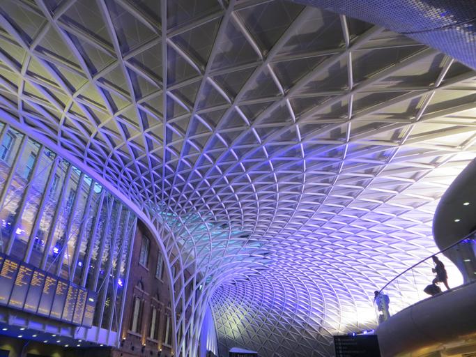 Keywords: king's cross kingscross london station railway interior roof lattice modern