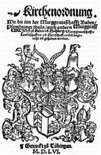 Keywords: Kirchenordnung 1556.JPG en Title page of the church order of the Lutheran Church of the Margravate of Baden-Durlach established 1556 de Titelblatt der badischen Kirchenordnung von 1556 Rudolf Burger Die Reformation im Markgräflerland Weil am Rhein 1984 S 107 Author 1556 PD-old-100 Charles II Margrave of Baden-Durlach Coats of arms of Baden |