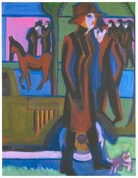 Keywords: Kirchner - Gehende Dame mit Hündchen - 1926.jpg en Walking woman with dog - Oil on canvas - 90 x 69 cm - Private estate Switzerland de Gehende Dame mit Hündchen - Öl auf Leinwand - 90 x 69 cm - Privatbesitz Schweiz repro from art book 1926 Creator Ernst Ludwig Kirchner Author died more than 70 years ago - public domain PD-old Paintings by Ernst Ludwig Kirchner Paintings of streets Dog walking Dogs in art Men facing right in art |