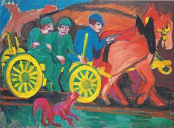 Keywords: Kirchner - Pferdegespann mit drei Bauern.jpg Pferdegespann mit drei Bauern oil on canvas cm 92 123 Werner Gabrielle Merzbacher repro from artbook 1920/21 Creator Ernst Ludwig Kirchner Other versions PD-old-auto-1923 1938 Paintings by Ernst Ludwig Kirchner Peasants in early 20th century Paintings of peasants 1920s paintings Kirchner Gabrielle and Werner Merzbacher Horse-drawn carts in art |