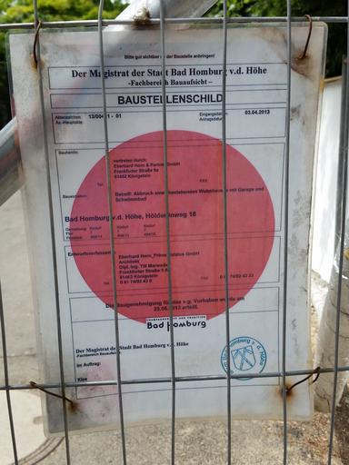 Keywords: Kirdorf Hölderlinweg 18 2 Abrissgenehmigung.jpg de Baustellenschild an der Einfahrt zum ehemaligen Gebäude das unter Denkmalschutz stand Von Straße aus fotografiert http //www fr-online de/bad-homburg-und-hochtaunus/bad-homburg-denkmal-ohne-schutz 1472864 30653064 html 2015-05-31 own WPbilder other versions Bad Homburger Hölderlinweg 18 cc-zero Uploaded with UploadWizard Cultural heritage monuments in Kirdorf |