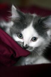 Keywords: kitten cat head face macro close up looking gray and white domestic pet mammal fur feline portrait animal symbol whiskers nose eyes