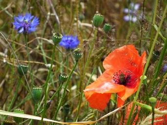Keywords: klatschmohn poppy red blue grass colorful summer meadow