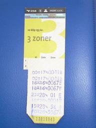 Keywords: Klippekort02.JPG 10-turs klippekort til 3 zoner i Københavnsområdet tidligere HT-område Train/bus ticket Copehangen The ticket allows for ten rides in a distance og 3 zones from where the journey starts 2 rides left 8 used In the bus or at the train station a machine cuts off a number and stamps the card with zone date time and machine number The machine clock is usually at least ten minutes ahead of real time giving the passenger a little extra time to ride or wait for connections own Own photo 2007-02-18 Danielle Keller PD Public transport tickets of Denmark |