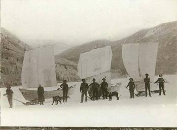 Keywords: Klondikers crossing frozen Lake Laberge with boats and sleds outfitted with sails, Yukon Territory, 1897 (LAROCHE 282).jpeg Photograph Creator Frank La Roche Caption on image Ice-sailing across Lake Le Barge Ice sailing across Lake Le Barge The lake is a beautiful sheet of water thirty-five miles long It is about twenty-four miles from the White Horse Rapids and the intervening River is smooth and deep the whole distance It is no uncommon thing for the boat to be wind bound for several days at a time When winter has set in and the lake has become a sheet of ice the delightful sensation of sailing across the frozen surface will not only be enjoyed but will hasten the traveler on his northward journey It is exhilarating and heathful and if the wind be favorable it will recompense the gold-seeker for previous delays The group in the photograph presents the appearance of a pleasure party rather than men who are fighting hardships Frank La Roche En Route to the Klondike 1898 Klondike Gold Rush Subjects LCTGM Ice--Yukon; Lakes ponds--Yukon; Iceboats--Yukon; Dogs--Yukon Territory Subjects LCSH Laberge Lake Yukon depicted place Lake Laberge 1897 Institution University of Washington UWASH-LAROCHE-source accession number laroche 282 PD-old-auto-1923 1936 Information field Order Number LAR231 Lake Laberge Klondike Gold Rush 1897 in Yukon Sailboats in Canada Frozen lakes of Canada Sled dogs Sledding in Canada Black and white photographs |