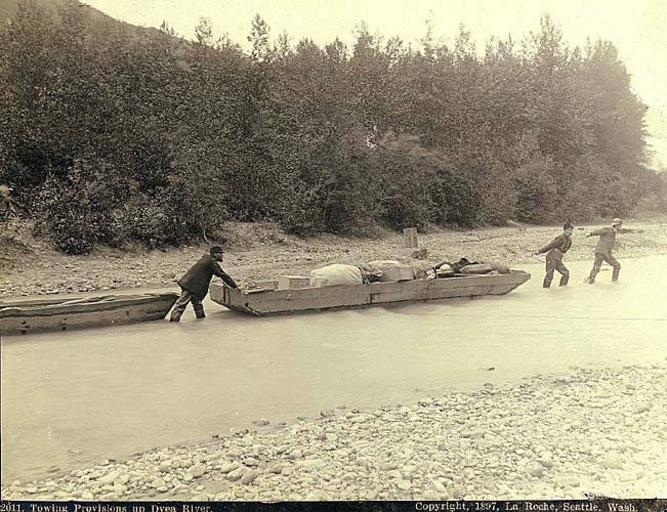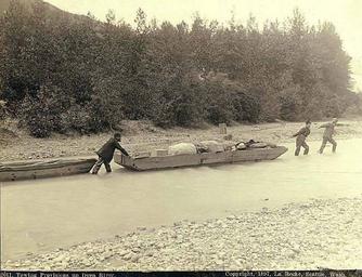 Keywords: Klondikers towing supplies up Dyea River using flat bottomed boat, Chilkoot Trail, Alaska, 1897 (LAROCHE 308).jpeg Photograph Creator Frank La Roche Caption on image Towing provisions up Dyea River c1897 Twelve hundred pounds are here loaded upon a flat-bottomed boat which is being pulled and pushed upstream to the head of canoe navigation about six miles north of Dyea It exhibits another method of moving supplies With indescribable toil hundreds of men labored on from day to day in an almost frenzied effort to reach Dawson City before the freezing of the lakes and rivers beyond the mountain passes; and in their desperation at the slow process made some would abandon their outfits and push on trusting to luck and a well-filled purse to take them through while others would cache their supplies with the hope of finding them again if compelled to turn back Frank La Roche En Route to the Klondike 1898 Klondike Gold Rush Subjects LCTGM Flatboats--Alaska; Rivers--Alaska Subjects LCSH Chilkoot Trail; Trails--Alaska; Dyea River Alaska depicted place Alaska 1897 Institution University of Washington UWASH-LAROCHE-source accession number laroche 308 PD-old-auto-1923 1936 Information field Order Number LAR203 Flatboats Taiya River Chilkoot Trail Trails |