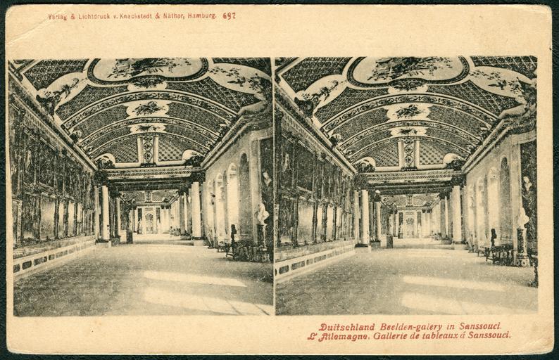 Keywords: Knackstedt & Näther Stereoskopie 0697 Duitschland, Beelden-galery in Sanssouci. L`Allemagne, Gallerie de tableaux à Sanssouci, Bildseite mit der Gemäldegalerie, Beschriftung niederländisch und französisch.jpg Stereoskopie der Firma Knackstedt Näther mit der fortlaufenden Nummer 697 hier mit einem Blick durch die Bildergalerie im Park des Schlosses Sanssouci in Potsdam Das auf Lichtdruck spezialisierte hamburger Unternehmen auch K N hatte für ihre stereographischen Ansichtskarten die DRGM-Nummern 83768 und 92395 eintragen lassen die auf dieser holländisch- und französisch-sprachigen Karte jedoch nicht mit aufgedruckt wurden Diese Karte wurde dankenswerterweise von Ilse Paul zur Verfügung gestellt um sie als Digitalisat über Wikimedia Commons nachhaltig allen Menschen zur Verfügung zu stellen Allemagne Gallerie de tableaux à Sanssouci Bildergalerie Sanssouci Scan vom Original Bernd Schwabe mit Dank an Ilse Paul ~ 1900 photographe inidentifié pour Knackstedt Näther <gallery> File Knackstedt Näther Stereoskopie 0697 Duitschland Beelden-galery in Sanssouci L`Allemagne Gallerie de tableaux à Sanssouci Revers Briefkaart Zijde voor het adres bestemd Côté réservé à l'adresse ungeteilte Rückseite jpg Revers de la carte postale No 697 </gallery> PD-old Documents by Ilse Paul Knackstedt Näther stereo cards Stereo cards of Berlin Postcards of Berlin Bildergalerie Sanssouci Potsdam |