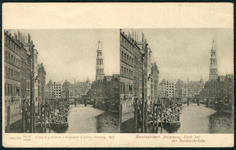 Keywords: Knackstedt & Näther Stereoskopie 0871 Deutschland, Hamburg, Fleth bei der Reimersbrücke, Bildseite Nikolaifleet Schiffe Katharinenkirche, Postkarte um 1900 DRGMs 83768 und 92395.jpg Stereoskopie der Firma Knackstedt Näther mit der fortlaufenden Nummer 871 hier mit einem Blick durch den Nikolaifleet mit Schiffen und der Reimersbrücke auf die Hauptkirche Sankt Katharinen in Hamburg Das auf Lichtdruck spezialisierte hamburger Unternehmen auch K N hatte für ihre stereographischen Ansichtskarten die DRGM-Nummern 83768 und 92395 eintragen lassen Diese Karte wurde dankenswerterweise von Ilse Paul zur Verfügung gestellt um sie als Digitalisat über Wikimedia Commons nachhaltig allen Menschen zur Verfügung zu stellen Scan vom Original Bernd Schwabe in Hannover mit Dank an Ilse Paul ~ 1900 unknown photographer; his work published by Knackstedt Näther <gallery> File Knackstedt Näther Stereoskopie 0871 Deutschland Hamburg Fleth bei der Reimersbrücke Adressseite der Postkarte ungeteilte Anschriftenseite jpg Adressseite ungeteilte Rückseite der Ansichtskarte </gallery> PD-old Documents by Ilse Paul Knackstedt Näther stereo cards Postcards of Hamburg St Katharinen Hamburg Nikolaifleet Stereo cards of Hamburg |