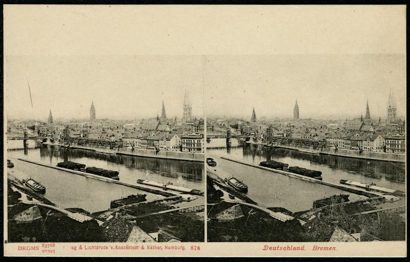 Keywords: Knackstedt & Näther Stereoskopie 0876 Deutschland, Bremen, Bildseite, Blick von der Halbinsel Stadtwerder über die Weser in Richtung Wilhelm-Kaisen-Brücke, Tiefer, Osterdeich, um 1900 DRGMs 83768 und 92395.jpg Stereoskopie der Firma Knackstedt Näther mit der fortlaufenden Nummer 876 hier mit einem Blick von der Halbinsel Stadtwerder über die Weser in Richtung der späteren Großen Weserbrücke Tiefer und Osterdeich zur historischen Innenstadt von Bremen Das auf Lichtdruck spezialisierte hamburger Unternehmen auch K N' hatte für ihre stereographischen Ansichtskarten die DRGM-Nummern 83768 und 92395 eintragen lassen Diese Karte wurde dankenswerterweise von Ilse Paul zur Verfügung gestellt um sie als Digitalisat über Wikimedia Commons nachhaltig allen Menschen zur Verfügung zu stellen Scan vom Original Bernd Schwabe in Hannover mit Dank an Ilse Paul ~ 1900 unknown photographer; his work published by Knackstedt Näther <gallery> File Knackstedt Näther Stereoskopie 0876 Deutschland Bremen Adressseite der Postkarte ungeteilte Anschriftenseite jpg Ungeteilte Rückseite der als Ansichtskarte vertriebenen Stereoskopie </gallery> PD-old Documents by Ilse Paul Knackstedt Näther stereo cards Stereo cards of Bremen Postcards of Bremen Osterdeich Tiefer Bremen Wilhelm-Kaisen-Brücke Ships in Bremen |