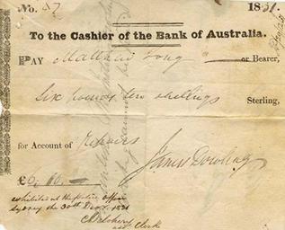 Keywords: Knatchbull forgery 1831.jpg Forgery by John Knatchbull in 1831 In February 1832 Knatchbull was found guilty of false making forging and counterfeiting a certain order for payment of money in the name of Judge James Dowling The forged note appears here as an exhibit for the prosecution Knatchbull was found guilty and given a death sentence which was later commuted to seven years to be served on Norfolk Island http //www records nsw gov au/archives/convict_records_example_8290 asp State Records of New South Wales 1831 John Knatchbull public domain due to age PD-Australia PD-old Forgery History of Australia Law enforcement in Australia 1831 documents |