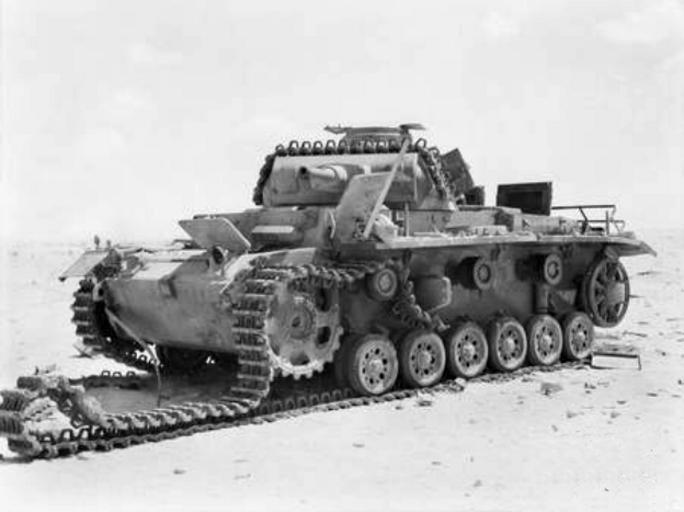 Keywords: Knocked out Panzer III near El Alamein 1942.jpg A knocked out German Panzer III in the Western Desert 025006 1942-09-16 Australian armed forces Image copyright Copyright expired - public domain frame cropped PD-Australia Panzerkampfwagen III during World War II Afrika Korps First Battle of El Alamein Black and white photographs |