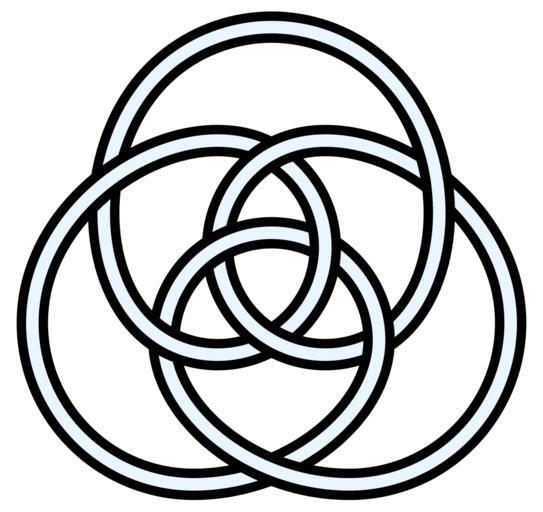 Keywords: Knot-9crossings-symmetrical.svg Decorative knot with nine crossings depicted with three-fold symmetry The central portion has a shape like a triquetra Topologically equivalent to File 9crossings-knot-symmetric-triangles-pseudo-valknut svg and File 9crossings-knot-symmetric-triangles-quasi-valknut svg For a 12-crossing symmetrical knot which visually extends this see Image 12crossings-rose-rhodonea-limacon-symmetrical-knot svg For another topologically distinct 9-crossing knot with three-fold symmetry see File 9crossings-decorative-knot-threefold-incircle svg Self-made graphic converted from a version of the following vector PostScript source code <pre> 306 396 translate 4 dup scale/x 240 3 sqrt div neg def 24 setlinewidth 1 setgray/A -120 x 360 210 360 arc 0 x 240 0 180 arc 120 x 360 180 330 arc 60 10800 sqrt rlineto gsave 60 setlinewidth 0 setgray stroke grestore stroke def A gsave 2 120 rotate A repeat grestore 60 setlinewidth 0 setgray 3 -120 x 360 277 302 arc stroke 0 x 240 47 71 arc stroke 120 rotate repeat 0 x 240 170 180 arc 120 x 360 180 187 arc stroke 1 setgray 24 setlinewidth 3 -120 x 360 276 303 arc stroke 0 x 240 46 72 arc stroke 120 rotate repeat 0 x 240 160 180 arc 120 x 360 180 188 arc stroke showpage EOF</pre> 2010 AnonMoos 9 crossing number knots and links Prime knots Decorative knots Chiral images with rotational symmetry Knot diagrams with 3-fold rotational symmetry Images with PostScript source code Knots and links on transparent background Outline knots and links Round graphic ornaments |