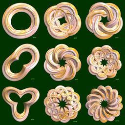| Keywords: mathematica 3d cg parametricplot3d texture torus knot 輪環 りんかん ドーナツ どーなつ 結び むすび 捩れ よじれ プログラム コード code program algorithm コード アルゴリズム geometric sculpture geometricsculpture shape geometry sculpture mapping テクスチャ マッピング 模様 もよう abstract 抽象 ちゅうしょう アブストラクト design pattern デザイン パターン graphic グラフィック グラフィクス structure 意匠 構造 symmetry 対称性 たいしょうせい シンメトリー 対称 たいしょう algorithm indoor black background a = 5; (* center hole size of a torus *) b1 = 9; (* number of cross *) b2 = 3; (* number of cross *) w = 2;(*gap width*) SetOptions[ParametricPlot3D, PlotRange -> Full, Mesh -> None, Boxed -> False, Axes -> None, PlotPoints -> 400, ImageSize -> 1500, Background -> Darker[Green, 0.8], PlotStyle -> Directive[Specularity[White, 90], Texture[Import["D:/tmp/861.jpg"]]], TextureCoordinateFunction -> ({#4 + #5, #5 / Pi} &), Lighting -> "Neutral"]; g[v_] := Sum[Cos[(2 k - 1) v]/(2 k - 1), {k, 4}]; x = (a - g[t] + w Sin[b1 s]) Cos[b2 s]; y = (a - g[t] + w Sin[b1 s]) Sin[b2 s]; z = Cos[b1 s] + Sin[t]; ParametricPlot3D[{x, y, z}, {t, 0, 2 Pi}, {s, 0, 2 Pi}] (*--- The Texture is this: www.flickr.com/photos/tanaka_juuyoh/5412528282/ *) a = 5; (* center hole size of a torus *) b1 = 9; (* number of cross *) b2 = 3; (* number of cross *) w = 2;(*gap width*) SetOptions[ParametricPlot3D, PlotRange -> Full, Mesh -> None, Boxed -> False, Axes -> None, PlotPoints -> 400, ImageSize -> 1500, Background -> Darker[Green, 0.8], PlotStyle -> Directive[Specularity[White, 90], Texture[Import["D:/tmp/861.jpg"]]], TextureCoordinateFunction -> ({#4 + #5, #5 / Pi} &), Lighting -> "Neutral"]; g[v_] := Sum[Cos[(2 k - 1) v]/(2 k - 1), {k, 4}]; x = (a - g[t] + w Sin[b1 s]) Cos[b2 s]; y = (a - g[t] + w Sin[b1 s]) Sin[b2 s]; z = Cos[b1 s] + Sin[t]; ParametricPlot3D[{x, y, z}, {t, 0, 2 Pi}, {s, 0, 2 Pi}] (*--- The Texture is this: www.flickr.com/photos/tanaka_juuyoh/5412528282/ *) |