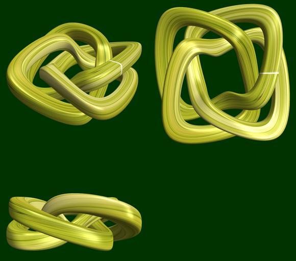 Keywords: mathematica 3d cg parametricplot3d texture torus knot 輪環 りんかん ドーナツ どーなつ 結び むすび 捩れ よじれ code program コード プログラム algorithm コード アルゴリズム geometric sculpture geometricsculpture shape geometry sculpture mapping テクスチャ マッピング 模様 もよう abstract 抽象 ちゅうしょう アブストラクト design pattern デザイン パターン graphic グラフィック グラフィクス structure 意匠 構造 symmetry 対称性 たいしょうせい シンメトリー 対称 たいしょう algorithm indoor a = 5; (* center hole size of a torus *) b1 = 4; (* number of cross *) b2 = 3; (* number of cross *) w = 2; (* gap width *) SetOptions[ParametricPlot3D, PlotRange -> Full, Mesh -> None, Boxed -> False, Axes -> None, PlotPoints -> 400, ImageSize -> 1600, Background -> Darker[Green, 0.8], PlotStyle -> Directive[Specularity[White, 90], Texture[Import["D:/tmp/71.jpg"]]], TextureCoordinateFunction -> ({#4 + #5, #5 / Pi} &), Lighting -> "Neutral"]; f[v_] := Sin[2 Sin[Sin[Sin[v]]]]; x = (a - Cos[t] + w Sin[b1 s]) Cos[b2 s]; y = (a - Cos[t] + w Sin[b1 s]) f[b2 s]; z = w Cos[b1 s] + f[t]; ParametricPlot3D[{x, y, z}, {t, 0, 2 Pi}, {s, 0, 2 Pi}] (*--- The Texture is this:http://www.flickr.com/photos/tanaka_juuyoh/5239255695/ *) a = 5; (* center hole size of a torus *) b1 = 4; (* number of cross *) b2 = 3; (* number of cross *) w = 2; (* gap width *) SetOptions[ParametricPlot3D, PlotRange -> Full, Mesh -> None, Boxed -> False, Axes -> None, PlotPoints -> 400, ImageSize -> 1600, Background -> Darker[Green, 0.8], PlotStyle -> Directive[Specularity[White, 90], Texture[Import["D:/tmp/71.jpg"]]], TextureCoordinateFunction -> ({#4 + #5, #5 / Pi} &), Lighting -> "Neutral"]; f[v_] := Sin[2 Sin[Sin[Sin[v]]]]; x = (a - Cos[t] + w Sin[b1 s]) Cos[b2 s]; y = (a - Cos[t] + w Sin[b1 s]) f[b2 s]; z = w Cos[b1 s] + f[t]; ParametricPlot3D[{x, y, z}, {t, 0, 2 Pi}, {s, 0, 2 Pi}] (*--- The Texture is this:http://www.flickr.com/photos/tanaka_juuyoh/5239255695/ *) |