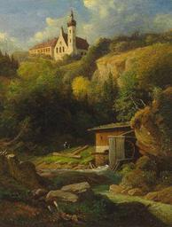Keywords: Köbel Andechs Blick zum Klosterhügel.jpg Andechs Blick von Bachlauf auf den Klosterhügel oil on canvas 41 x 33 cm zeller de century 19 Georg Franz Köbel 1807 “1894 PD-art Churches in Bavaria in art Kloster Andechs Images from Auktionshaus Zeller History of Landkreis Starnberg |