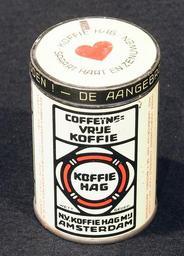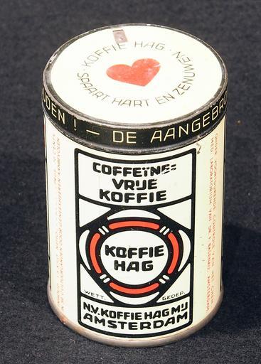 Keywords: Koffie Hag bus, foto 1.JPG Very old packaging of a Dutch product that is not produced and not sold any more Photographed at a collector of Droste For info see http //www tincollectors nl/ tincollectors nl or email info tincollectors nl own 2014-04-11 09 26 32 Alf van Beem CC-Zero Trademarked Coffee tins |