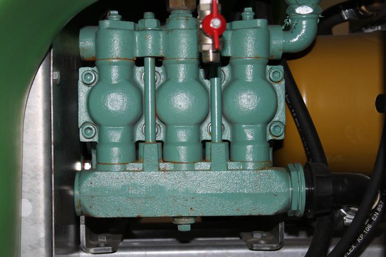 Keywords: Kolbenpumpe einer Spritze.jpg Kolbenpumpe mit drei Kolben an einer Pflanzenschutzspritze Rechts Zapfwellenanschluss gelb Own 2015-02-22 Kopiersperre <span class signature-talk ></span> PD-own Piston pumps